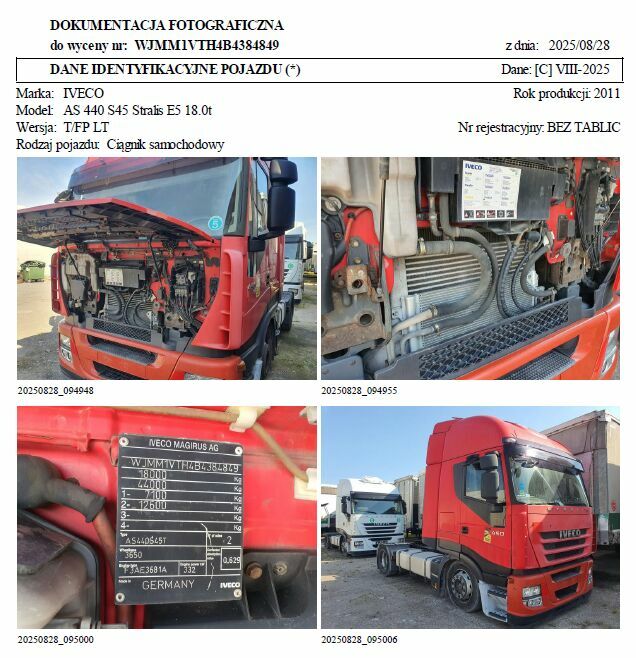 AZh. Syndyk masy upadłości MWB-Trans Mariusz Wieczorek w upadłości, wyznaczony w postępowaniu upadłościowym prowadzonym przed Sądem Rejonowym w Rzeszowie, V Wydział Gospodarczy ds. Upadłościowych i Restrukturyzacyjnych, sygn. akt: RZ1Z/GUp/46/2025, sprzedaje ciągnik samochodowy marki:Iveco, model: AS 440 S45 Stralis E5 18.0t, nr rej. brak tablic, rok prod. 2011, VIN WJMM1VTH4B4384849, data pierwszej rejestracji 30.11.2011 r., przebieg szacowany 1500000 km, diesel, ciągnik siodłowy z kabiną długą, poj. 10 300 ccm / 331 kW (450 KM).