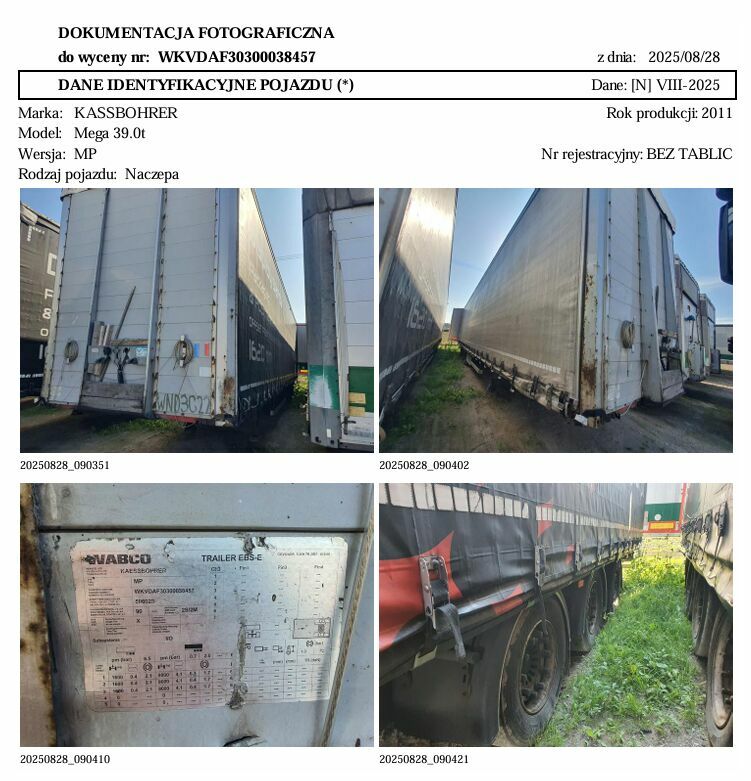 AZh. Syndyk masy upadłości MWB-Trans Mariusz Wieczorek w upadłości wyznaczony w postępowaniu upadłościowym prowadzonym przed Sądem Rejonowym w Rzeszowie V Wydział Gospodarczy ds. Upadłościowych i Restrukturyzacyjnych sygn. akt: RZ1Z/GUp/46/2025, sprzedaje naczepę marki:Kassbohrer, model: Mega 39.0t, nr rej. WM0897P, rok prod. 2011, VIN WKVDAF30300038457, data pierwszej rejestracji 10.11.2011 r., okres eksploatacji pojazdu (11/05/15 - 25/08/06), skrzyniowa z opończą typu kurtyna.